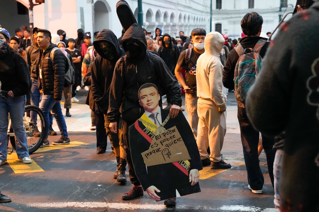 Con carteles de «Sube la gasolina, sube todo» y al ritmo de cánticos como «¡Fuera, Noboa, fuera!», los manifestantes caminaron desde un parque del norte hacia el centro colonial, donde la sede presidencial estaba acordonada por vallas metálicas y una gran presencia de policías y militares.